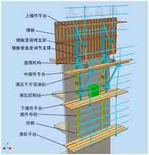 主要由爬升系統(tǒng)、大鋼模板、退模機(jī)構(gòu)、模板固定支架、外爬架、 液壓系統(tǒng)、電控系統(tǒng)、外防護(hù)系統(tǒng)、操作平臺(tái)系統(tǒng)等九大部分組成